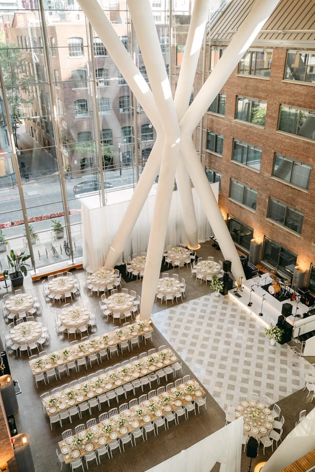 Since it’s completion in 1910, the historic building at 134 Peter Street has been well inhabited. It began as a Weston’s Biscuit Factory, filling the air with intoxicating fresh-baked aromas. By the 1970s, it had been transformed into a high-end fashion showroom. And over the last few decades, it has spent time operating as an art gallery and even a nightclub. Today, the original building still stands, but in a completely re-imagined way. It lives at the heart of Toronto’s most innovative tower – a newly built engineering marvel that sits on top of and exists as part of the original 134. QRC West is a historic building in downtown Toronto, boasting exposed brick and modern adaptations. Upon entry you arrive at the stunning Atrium, our dramatic and inspired open event space. Throughout sit our most impressive features – three massive, interlocked, 70-foot delta frames, providing grand architectural integrity and allure. The Atrium is contemporary yet classic. It combines intimacy with grandeur, character with luxury, and it’s designed to be transformed to bring your unique occasion to life.