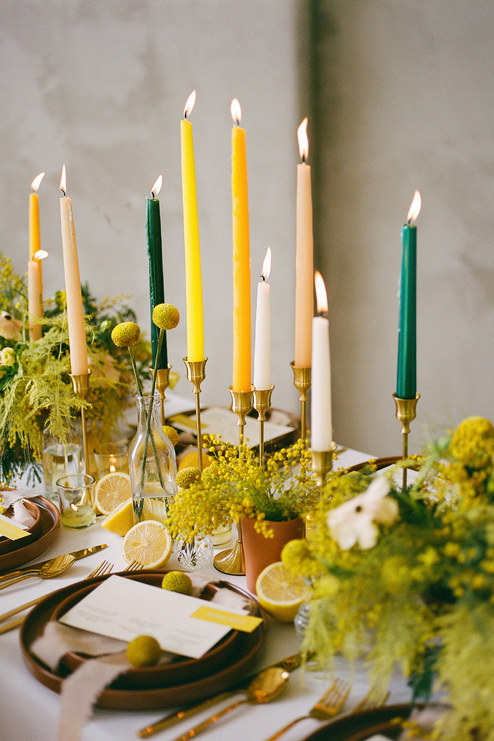 Garden of Aden Florals brought the room alive with loose, airy bouquets full of texture and personality. The look toyed with sunny yellow hues, crisp whites, and sprigs of whimsical blooms, all paired with the natural citrus accents that dotted the table. The atmosphere was set just right by layers of tall, slender taper candles in earthy greens and soft creams, which provided a warm glow to the space.