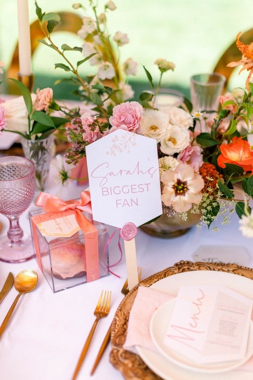 A beautiful sunny day is the perfect excuse for a cute and fun mobile lemonade/cocktail station for guests. Later, everyone can convene underneath a heavenly tent from Sunshine Party and Tent Rentals, that’s been beautifully decorated with a bright and bold balloon ceiling by Lylydiy. This ambiance helps in setting the tone for a night of whimsy and summery chic #goodvibes. A sense of play and ethereal charm is plentiful and found in everything from the sorbet-inspired palette to the stationery and graphic designs by The Paper Boutique. A touch of radiance and glam, as seen in the sleek and metallic chair and linens by Right Choice Linen Rentals platters and coasters by Carli D., and flatware and glassware by Table Tales, gives the perfect chef’s kiss to the night.