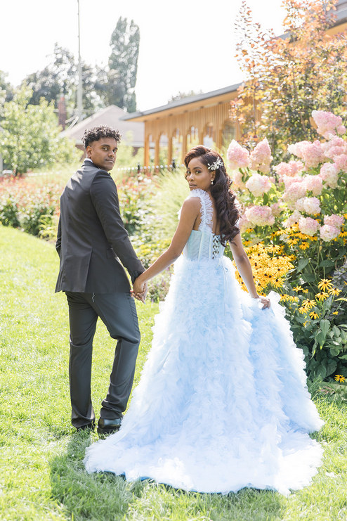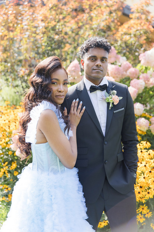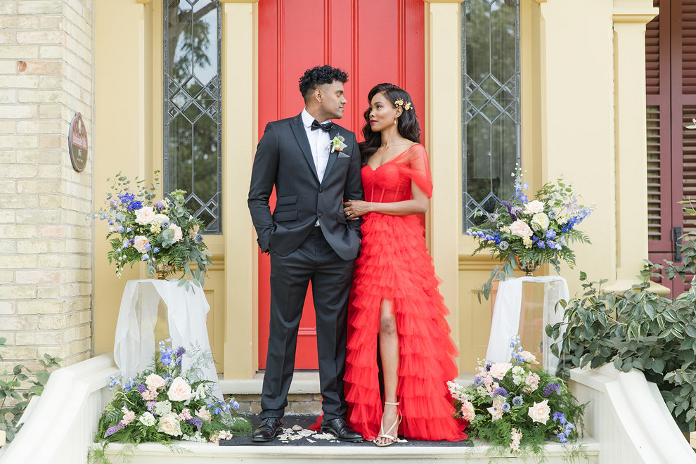 The glamorous bride dazzled in a fairy-talesque blue ruffle dress from Rent The Couture, setting the stage with an enchanting presence. She then transformed into a striking red gown, adding a dynamic new layer to the shoot’s narrative. Her hair, meticulously styled by Livia Event Styling, perfectly complemented both ensembles, while Toni Rose Muahs ensured a flawless finish with her makeup artistry. The look was completed with delicate bridal accessories and jewelry from Blair Nadeau Bridal. Meanwhile, groom Kavin Ketheeswaran exuded sophistication in a regal black tuxedo from Tom's Place. Together, they created a picture-perfect scene against the venue’s rich backdrop, harmonizing beautifully with the opulent surroundings.