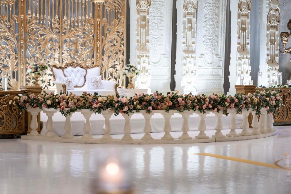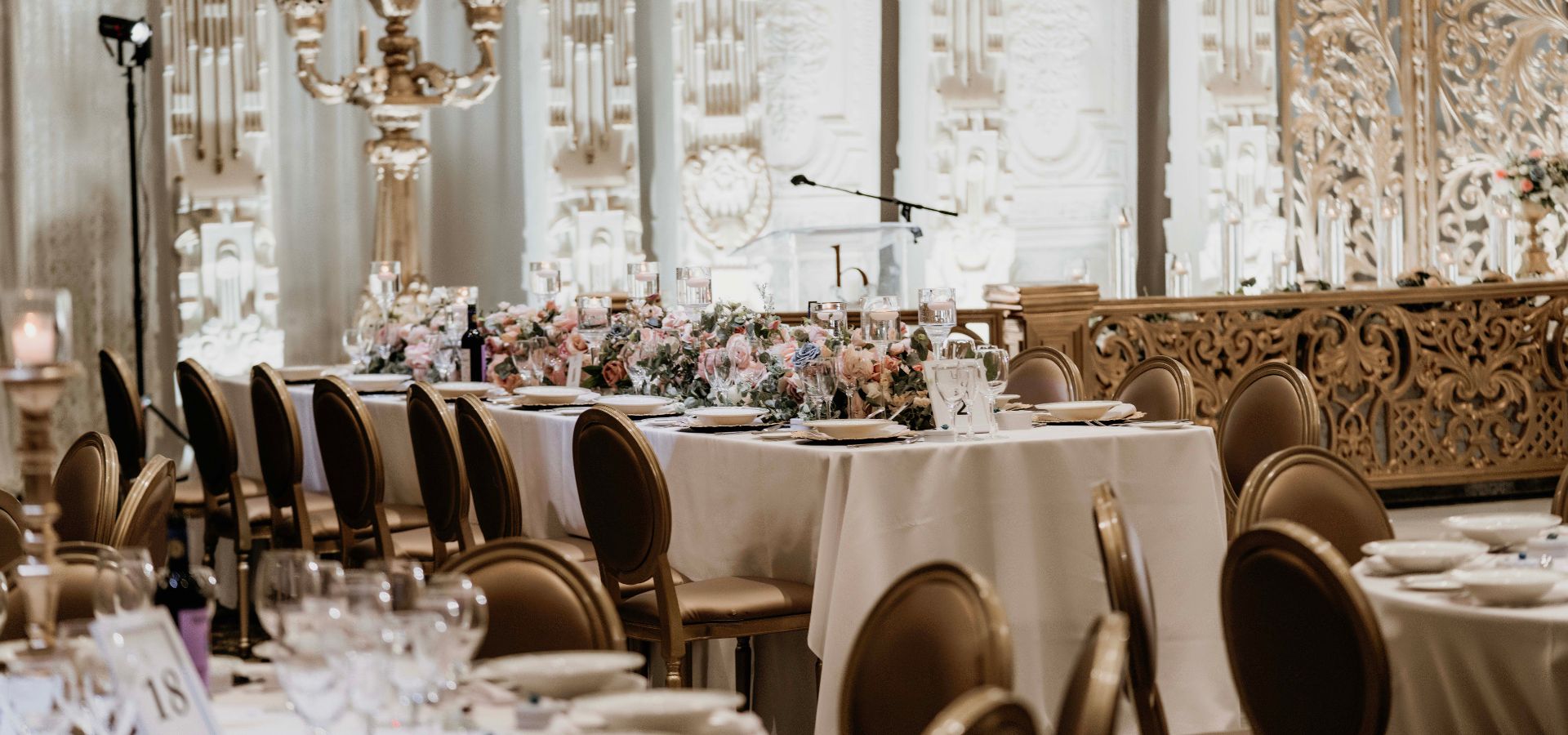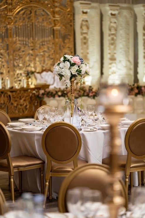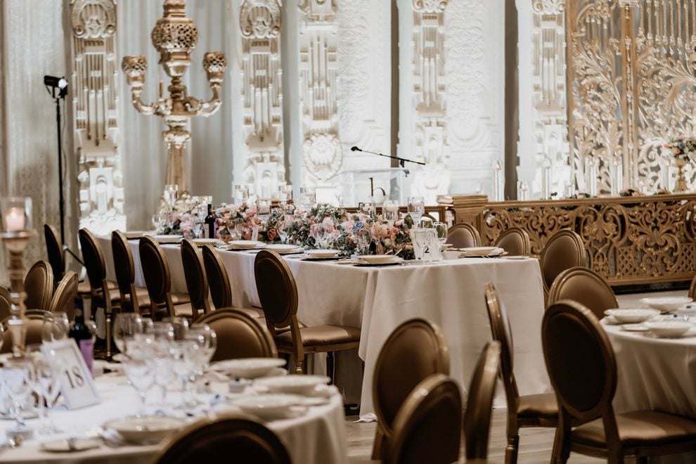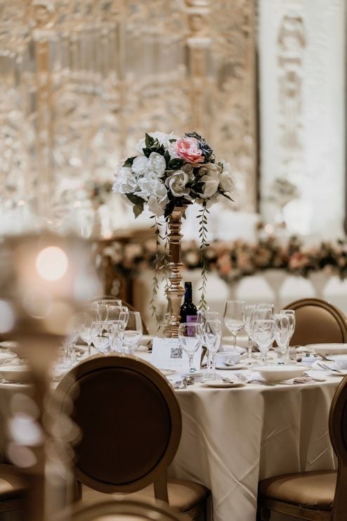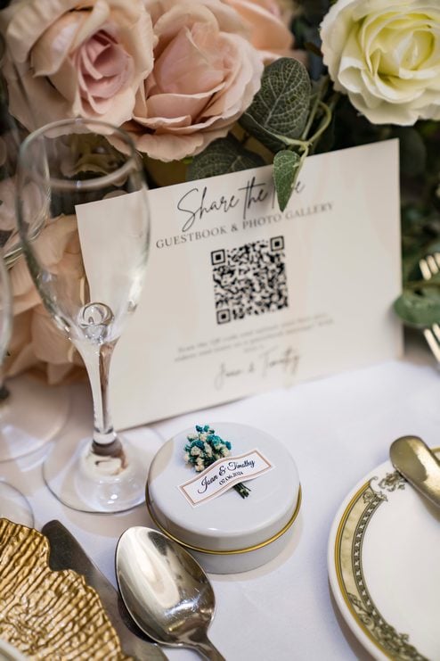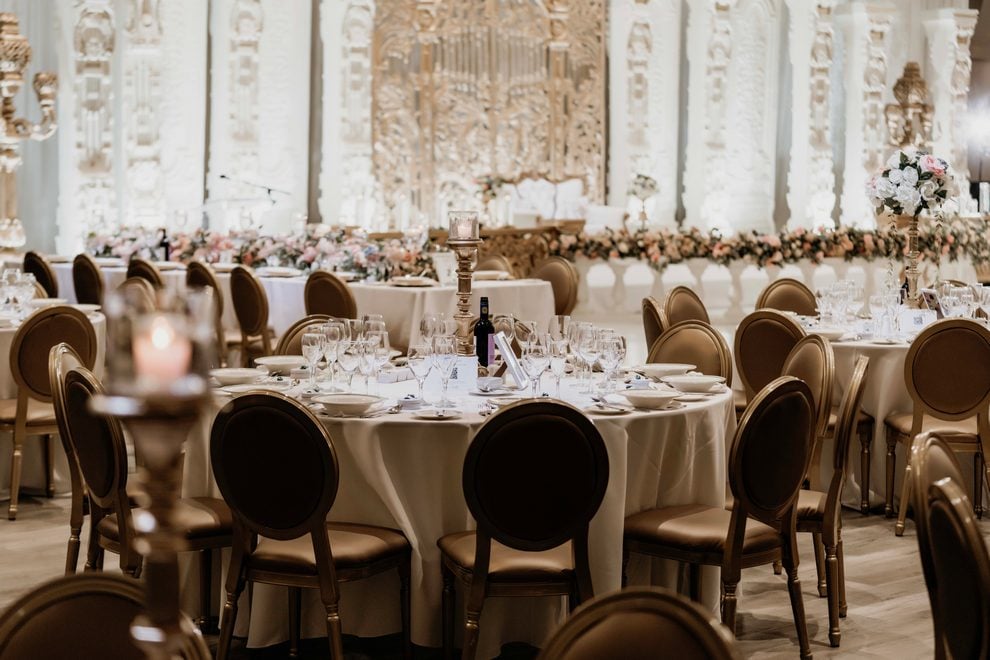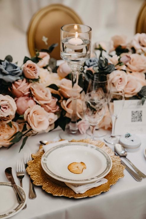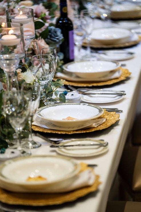 The reception was every bit as lovely. Ever After by Justine planned a stunning setup, and Dream Party Decor brought the space to life with soft lighting, lush florals, and elegant table settings from the plates to the personalized touches. Guests found their seats at tables decorated with thoughtful centerpieces, and Joan and Tim had their own cozy spot to soak it all in.