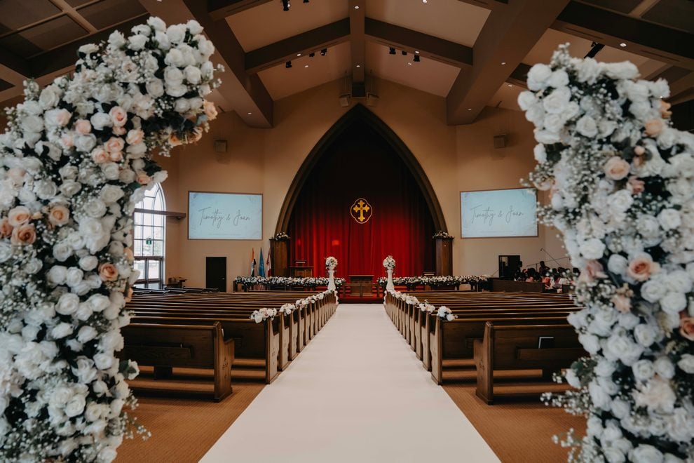 Their ceremony was romantic and full of heart, with floral bouquets lining the pews and sunlight pouring in as Joan walked down the aisle. When she and Tim locked eyes, it was pure magic. The way they looked at each other said it all.