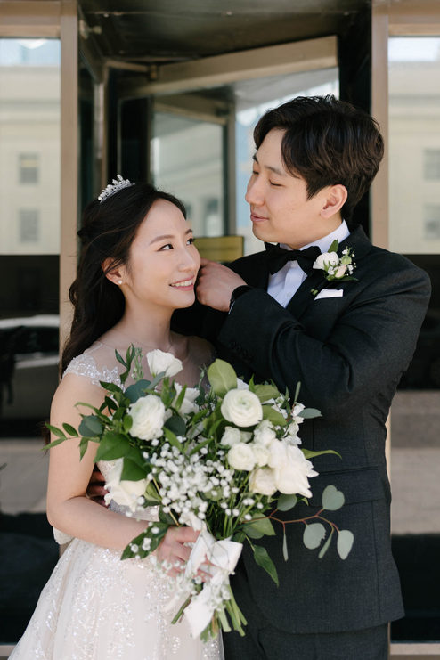 Before the vows were exchanged, Alice and Tony took a quiet moment for their photoshoot on the sun-kissed streets of Toronto. The city’s vibrant energy provided a stunning contrast to the couple’s joy. They walked hand in hand, smiling and enjoying the moment.