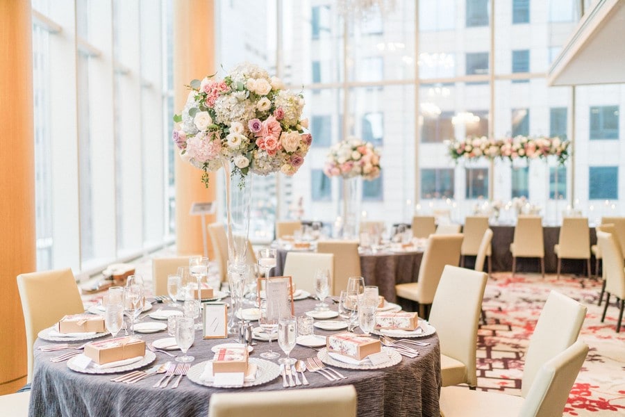 Christina and Tao had a classic and intimate wedding planned by Wedella. A simple colour palette of purple, pink and ivory with a splash of red for good luck was an elegant choice to enhance the architecture of the Shangri-La Hotel, Toronto. From the favour boxes filled with candy to the rice paper flowers on the cake, this wedding was perfectly sweet.