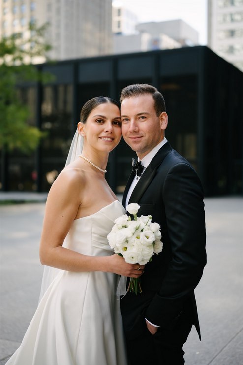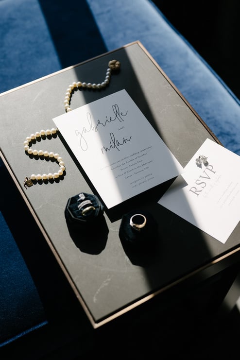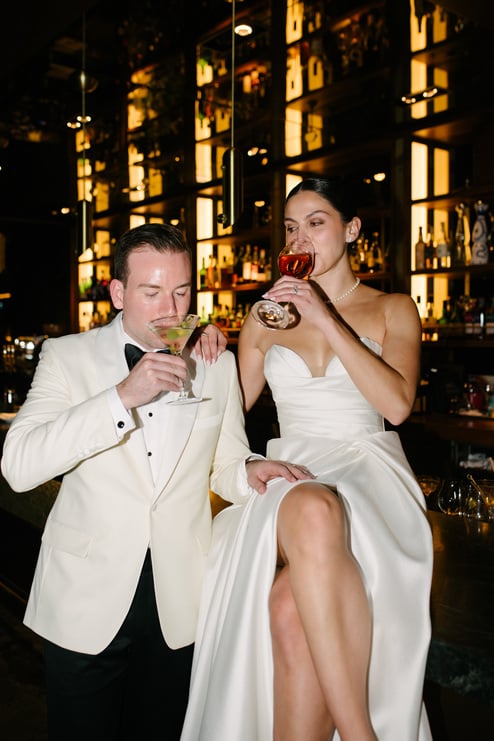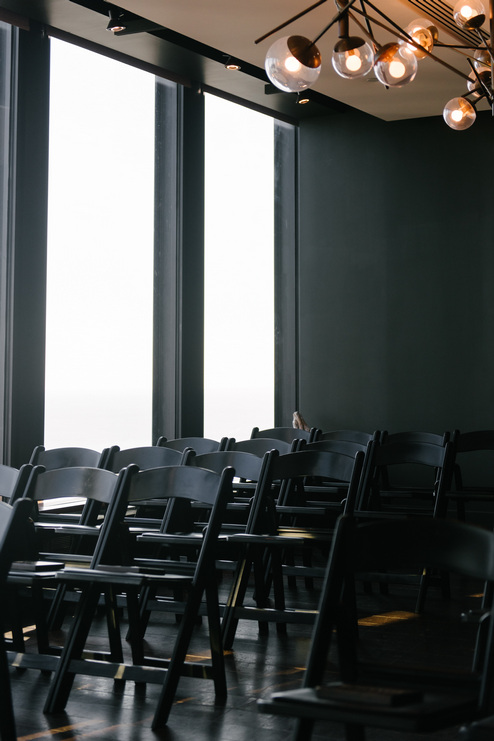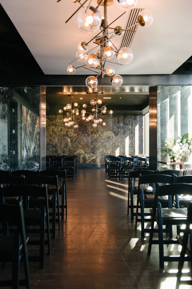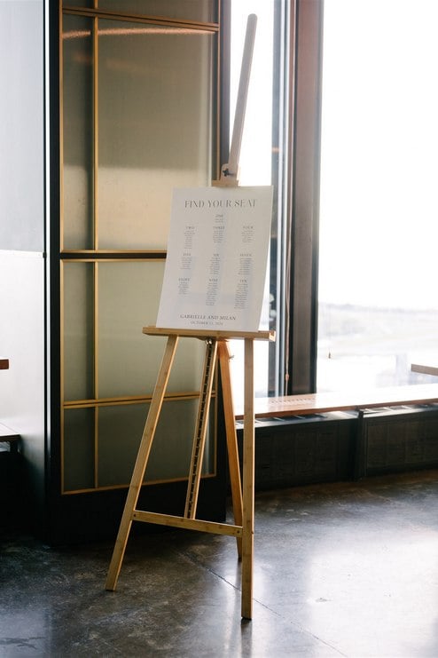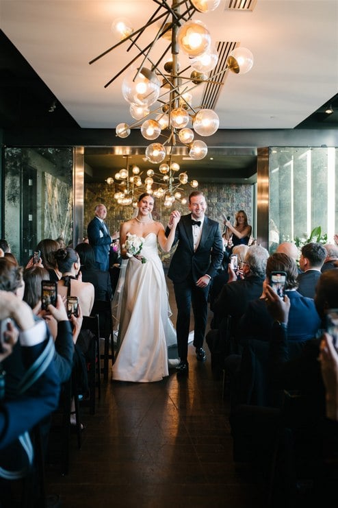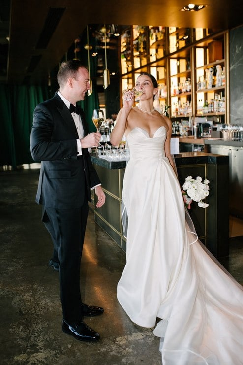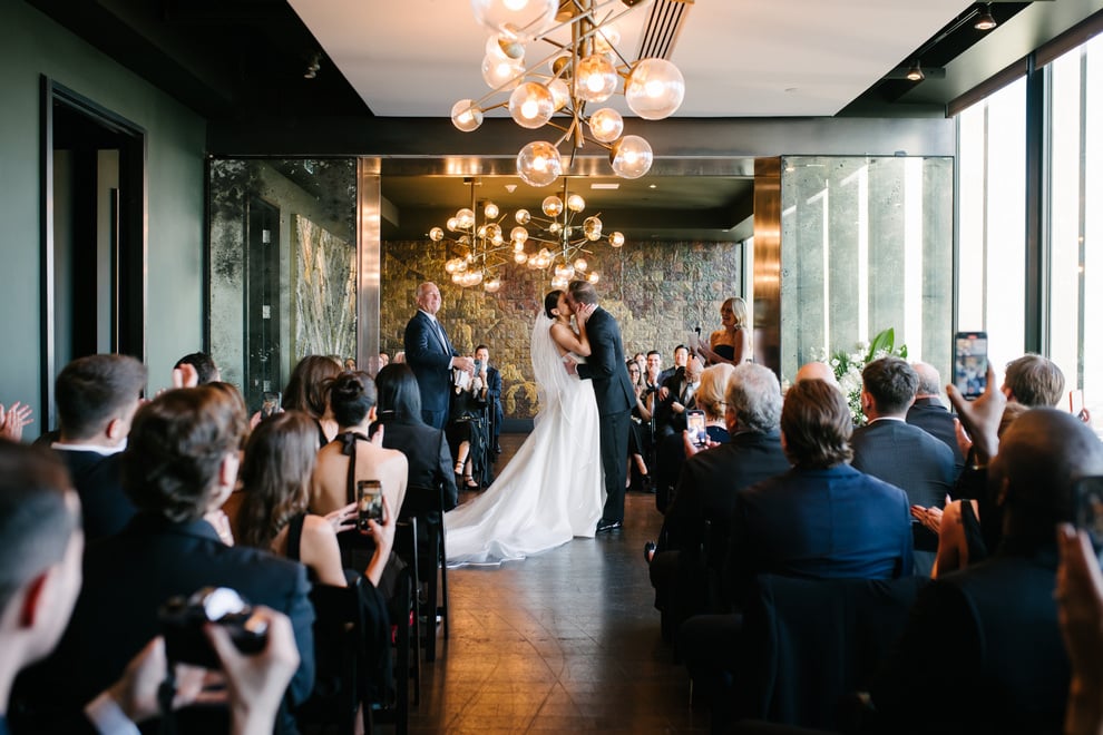 Everything about the celebration felt intimate and effortless. Allyssa Helm Beauty & Co. gave Gabrielle a glowing, soft-glam look that perfectly matched the romantic vibe of the day. The ceremony took place indoors, with black chairs arranged beneath Emblem Floral Design Studio’s understated yet artful arrangements. Their first kiss as newlyweds was followed by a champagne toast and a walk through the candlelit space, still beaming.