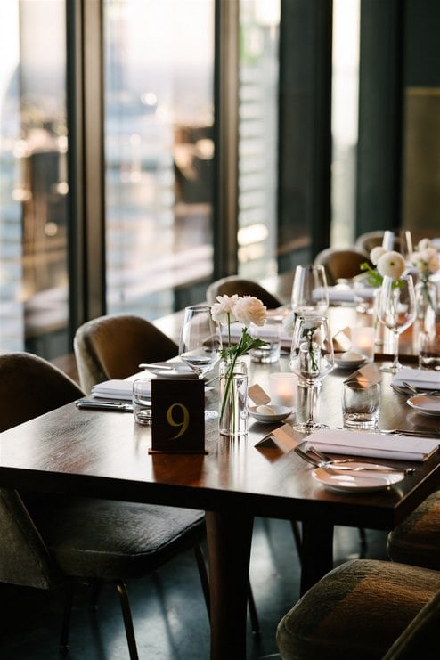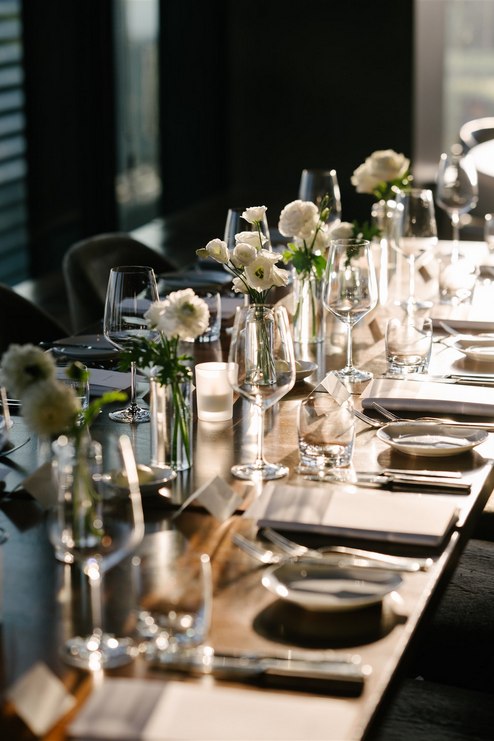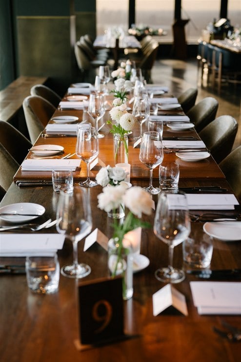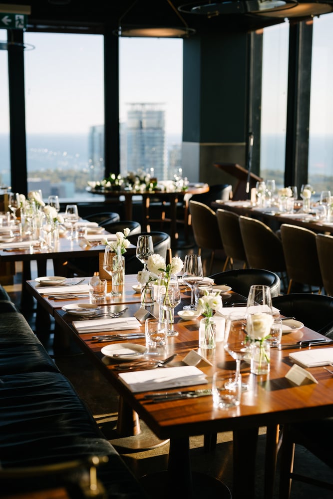 Dinner was set around long tables styled with elegant tableware, seating cards, and warm lighting. The florals added colour and softness, while the view added its own magic. Guests enjoyed cocktails and shared plates as Gabrielle and Milan snuck out for a sip of white wine before rejoining the party.