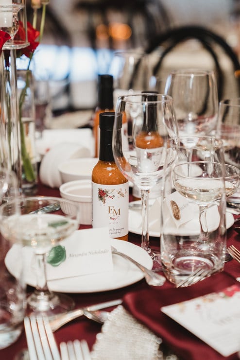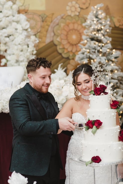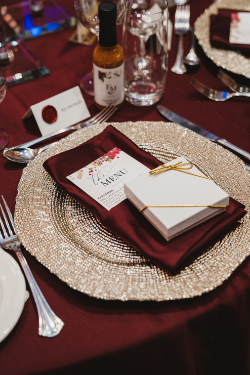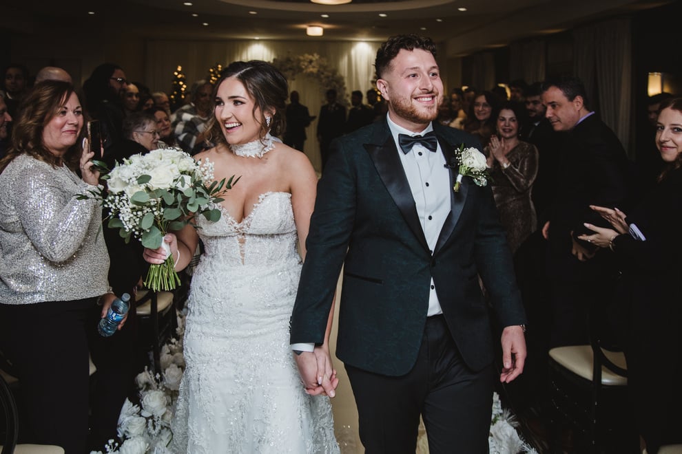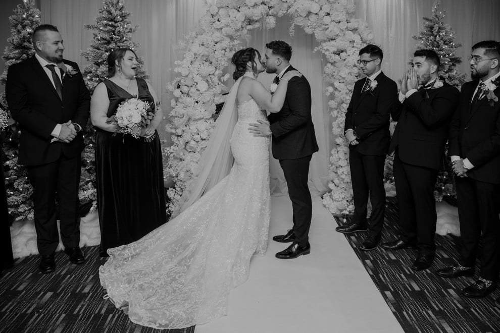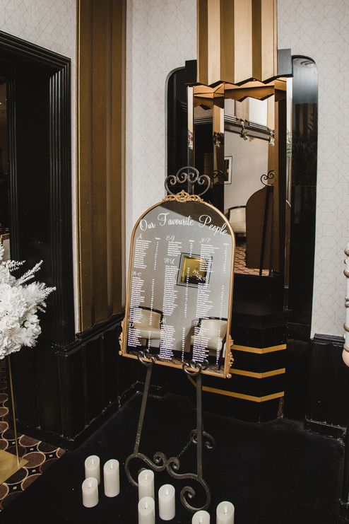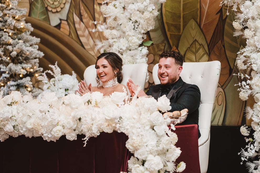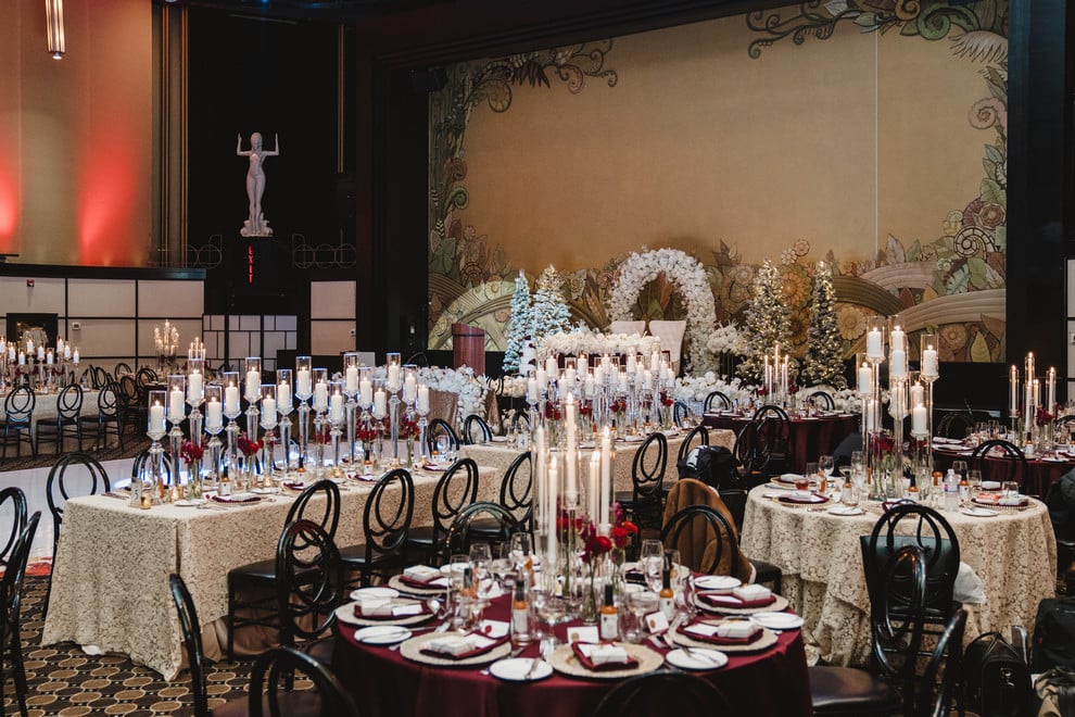 My Wedding Officiant led a heartfelt ceremony beneath sweeping art‑deco arches and lush florals from Dynasty Events and Florals. After that, guests stepped into a reception that felt equal parts classic and fun. Champagne and Macarons orchestrated every detail while Elite Decor by S&S filled the room with candlelight, satin linens, and dramatic centerpieces. A glossy vinyl dance floor by Axe Media Group grabbed everyone’s attention, and Feedback Event Services kept it packed all night with a flawless mix of favorite hits. Sax player Murray Heaton joined in for a few live sets, adding a smooth vibe that had everyone swaying.