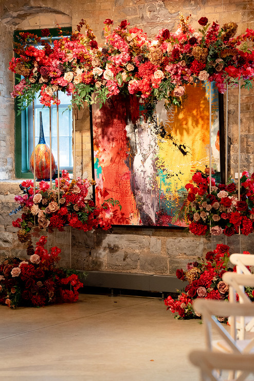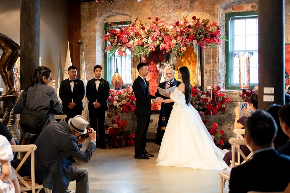 The ceremony space felt intimate and warm, with soft florals and flickering candles adding a dreamy touch to the venue’s artistic backdrop. When they exchanged vows, you could feel the emotion from everyone in the room.