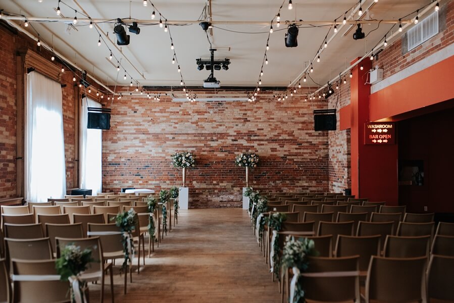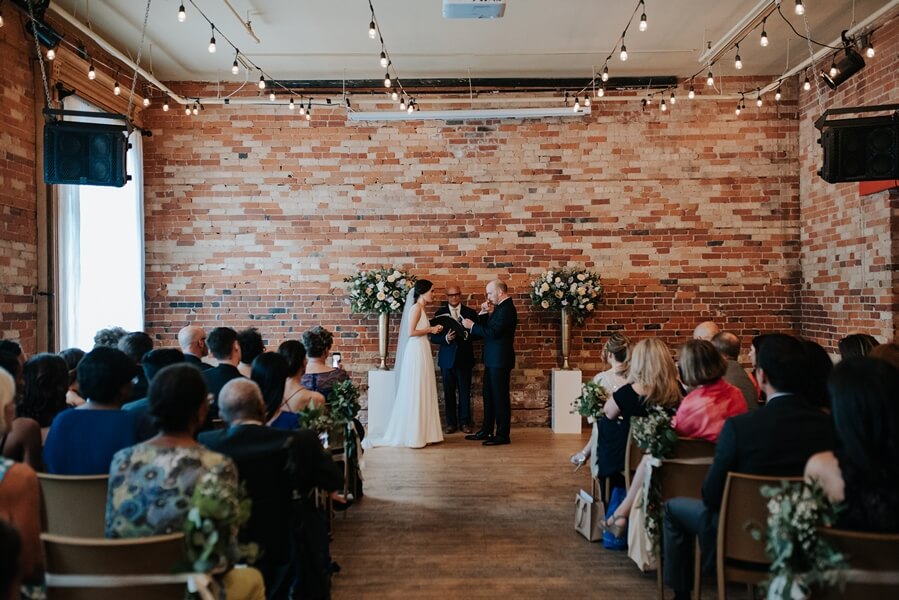 Keeping in line with the simple and streamlined stylings of the day, the exposed brick wall, accented by loose, organic florals, made the perfect focal point for the couple’s intimate ceremony.