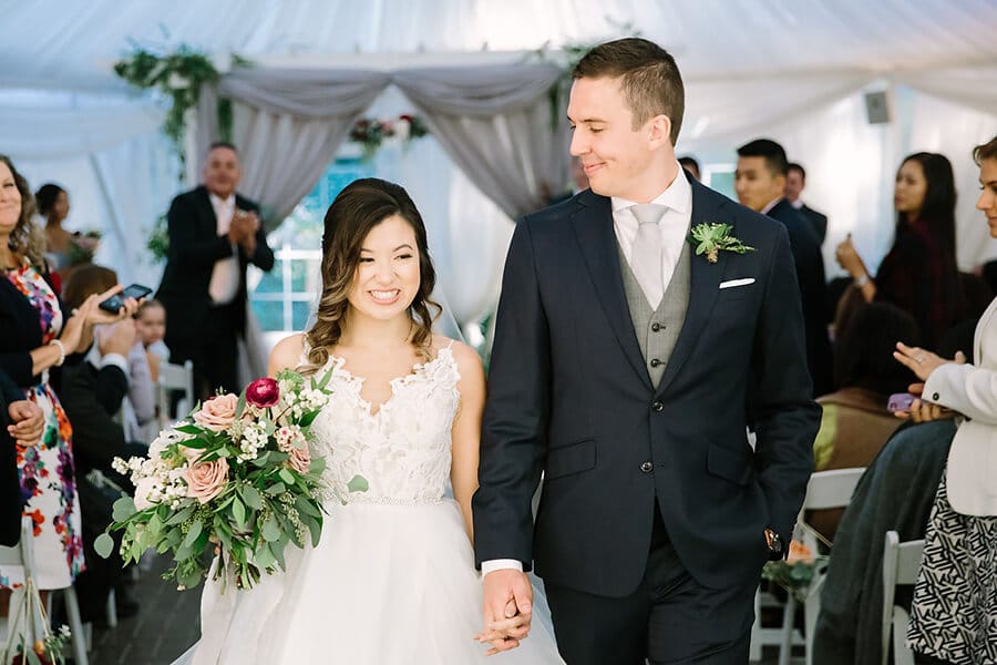 A showstopping white tent, as well as a dreamy altar with lush florals featuring a fall inspired palette from Coriander Girl, provides the perfect backdrop for the couple to exchange vows in front of family and friends.