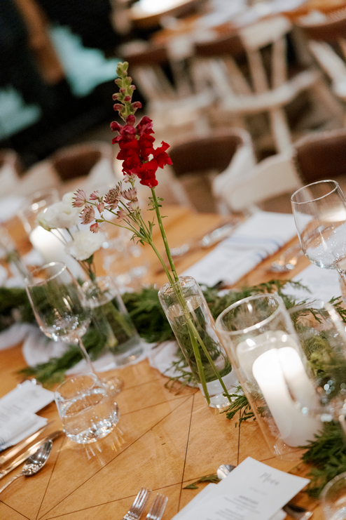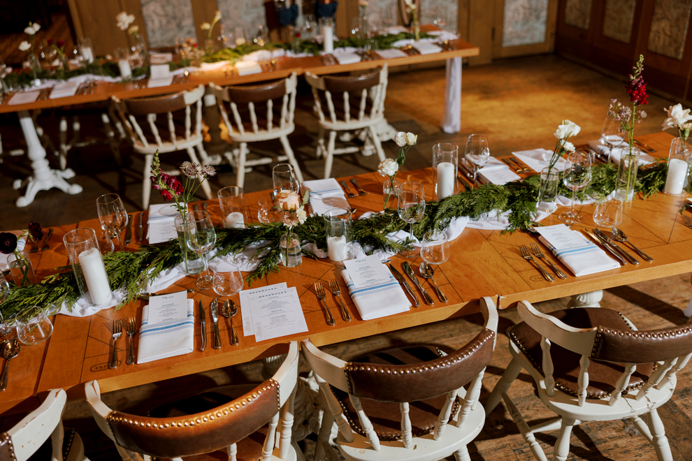 The bride’s morning started her morning surrounded by calm and excitement, with Presley Foskett Makeup enhancing her natural glow and styling her hair into a look that was effortlessly chic. The ceremony space came alive with stunning floral creations from Thyme Studio, filling the room with color, texture, and a soft, romantic fragrance.