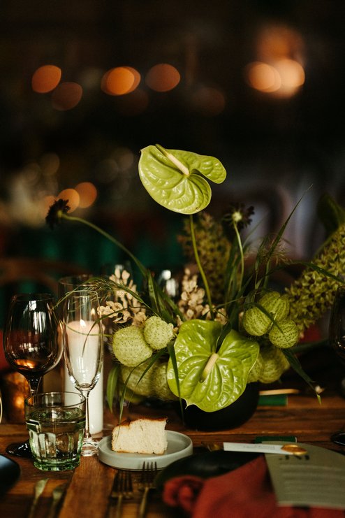 The wedding ceremony unfolded amidst the warm, earthy tones of a fall day at the venue. Thanks to the creative genius of Smells Like Flowers, the venue was adorned with rustic décor elements, including mushrooms and branches on the tables, creating an enchanting atmosphere. The grooms, accompanied by live music, walked down the aisle surrounded by their closest loved ones, and the open brick space provided a charming backdrop for their heartfelt ceremony.