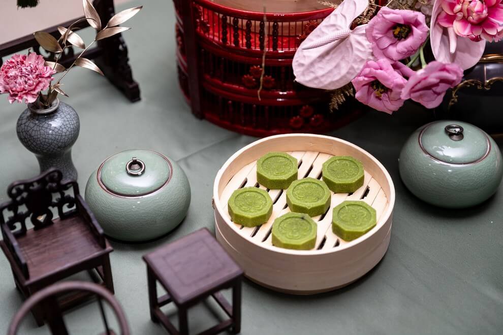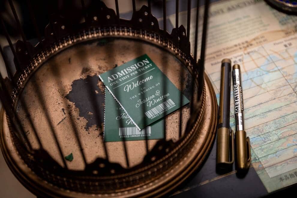 The couple’s awe-inspiring reception was inspired by “The Lotus Pool by Moonlight,” a unique Chinese style emerald wedding with thousands of details. The couple wanted to bring the beauty of nature into their art gallery venue. Shades of emerald were evident throughout, including the emerald-coloured round invitation with a moon inside to bring out the theme. Everything in the wedding was symbolically round, like the lotus, from the venue to the centerpieces and table numbers to the round dance floor with a customized wedding monogram featuring the bride and groom’s Chinese name. Delicate details were throughout, including the stunning flowers were from Flowers Time and the receiving table that featured an oil-paper umbrella and tassels backdrop. Guests were treated to Chinese traditional cakes and cookies, and a delectable cake from Yue’s Cake Boutique.