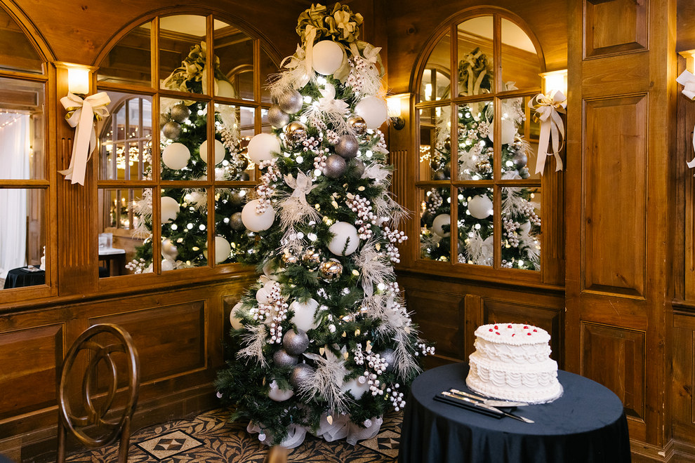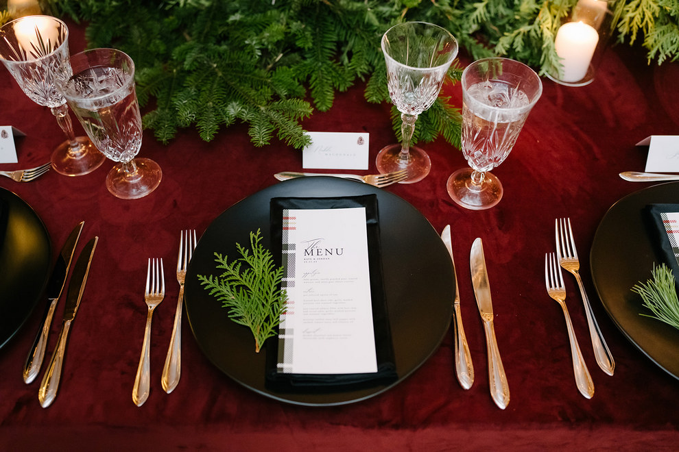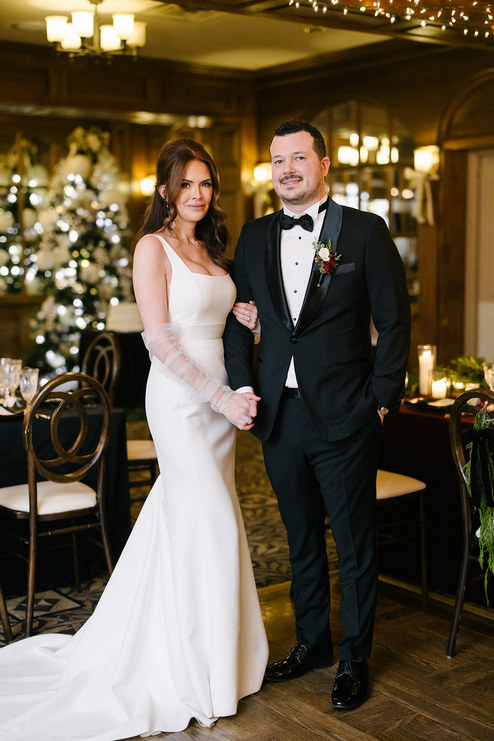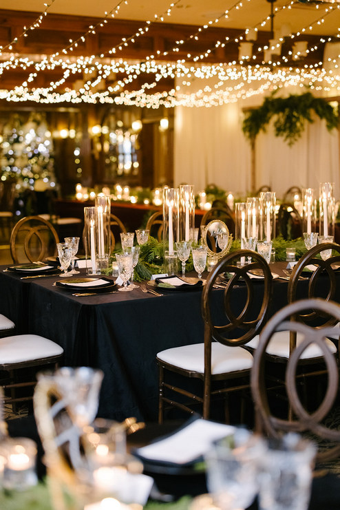 The reception was a dazzling celebration of love wrapped in the wintery charm. Decorated by Simply Beautiful Decor and Boutique Linen Rentals, the space featured green, navy, and black accents that complemented the soft glow of fairy lights. Guests were welcomed with the comforting aroma of seasonal florals and the shimmer of candlelight dancing on velvet-draped tables, while personalized details like custom signs by Find Me Lettering and beautiful stationery by Branca Design added meaningful touches that made the space uniquely theirs.