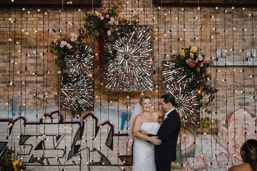 While we’re absolutely loving the boho-chic vibe and vintage details, our favourite thing about this pop-up chapel is that it was designed to be completely eco-friendly! All of the decor was hand made from found objects that were either rented or sourced from thrift shops; the florals were foraged or purchased from local farms; and even the menu was designed to be completely waste-free! On top of that, a portion of the proceeds goes to the Evergreen Brick Work’s Children’s Garden charity. How can you not love everything about this? We asked the couples to weigh in on their experience.