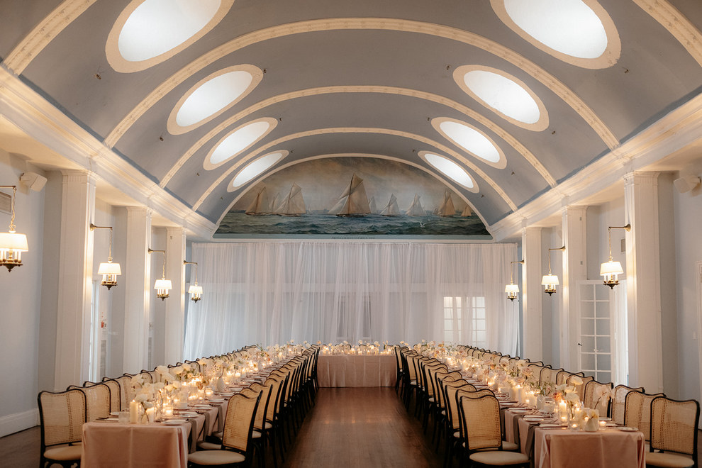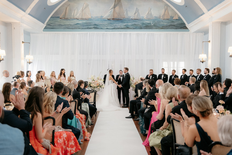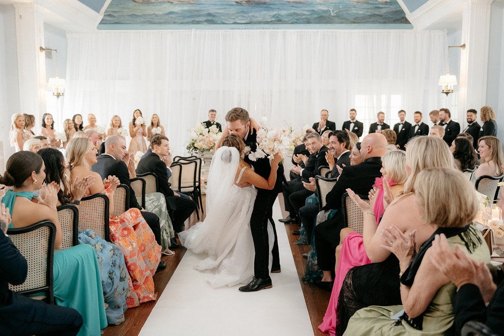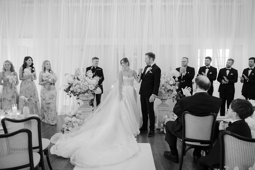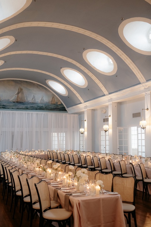 With planning by Mad Bash Group, the entire celebration flowed effortlessly from ceremony to reception. Soft, abundant blooms by Flower Treasures filled the space with texture and movement, complementing the natural blues of the water and sky. Elegant furnishings from Divine Furniture Rental, paired with styling from Simply Beautiful Decor and Gervais Party & Tent Rentals, transformed the yacht club into a refined yet welcoming setting for dinner and dancing.
