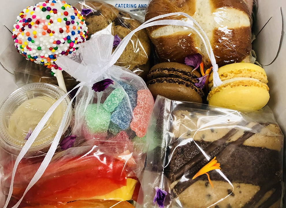 “Here’s one of the big items people are loving while still trying to have some celebrations. We wanted people to enjoy a little sweet and savoury, while keeping a boutique look to it all. These boxes are one of our ‘Cocktail Party’ boxes. Inside you’ll find a mix of sweet and salty including; Crudités and Hummus, Pretzel Deli Slider, Fresh Baked Vegan Cookies, Assorted Macarons, Cake Pops, Brownie Bites and a little Satchel of Jellie Candies.” – Chef On The Go Catering & Event Services