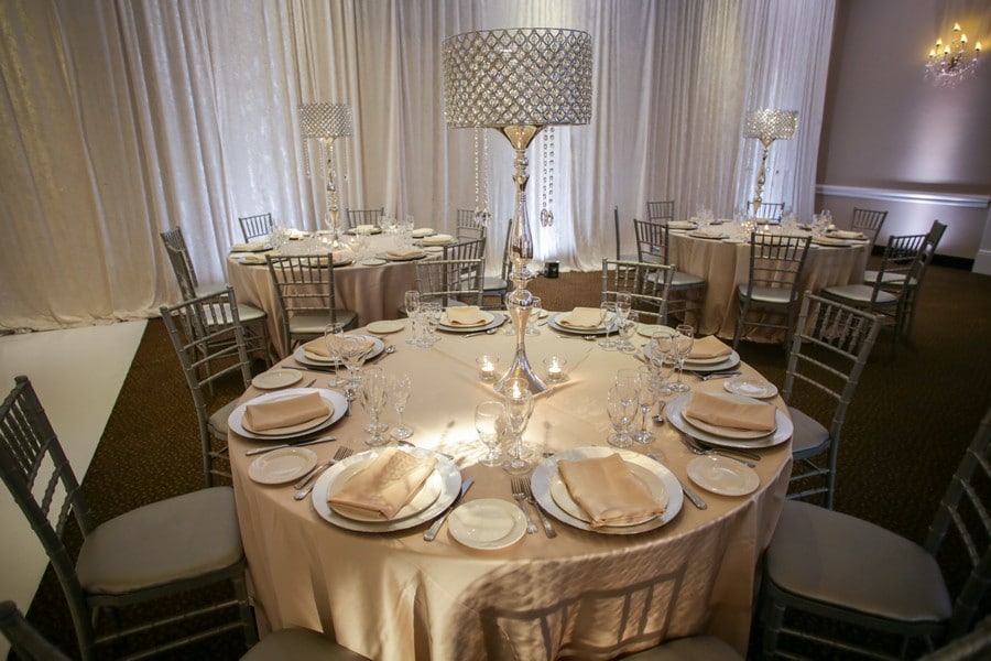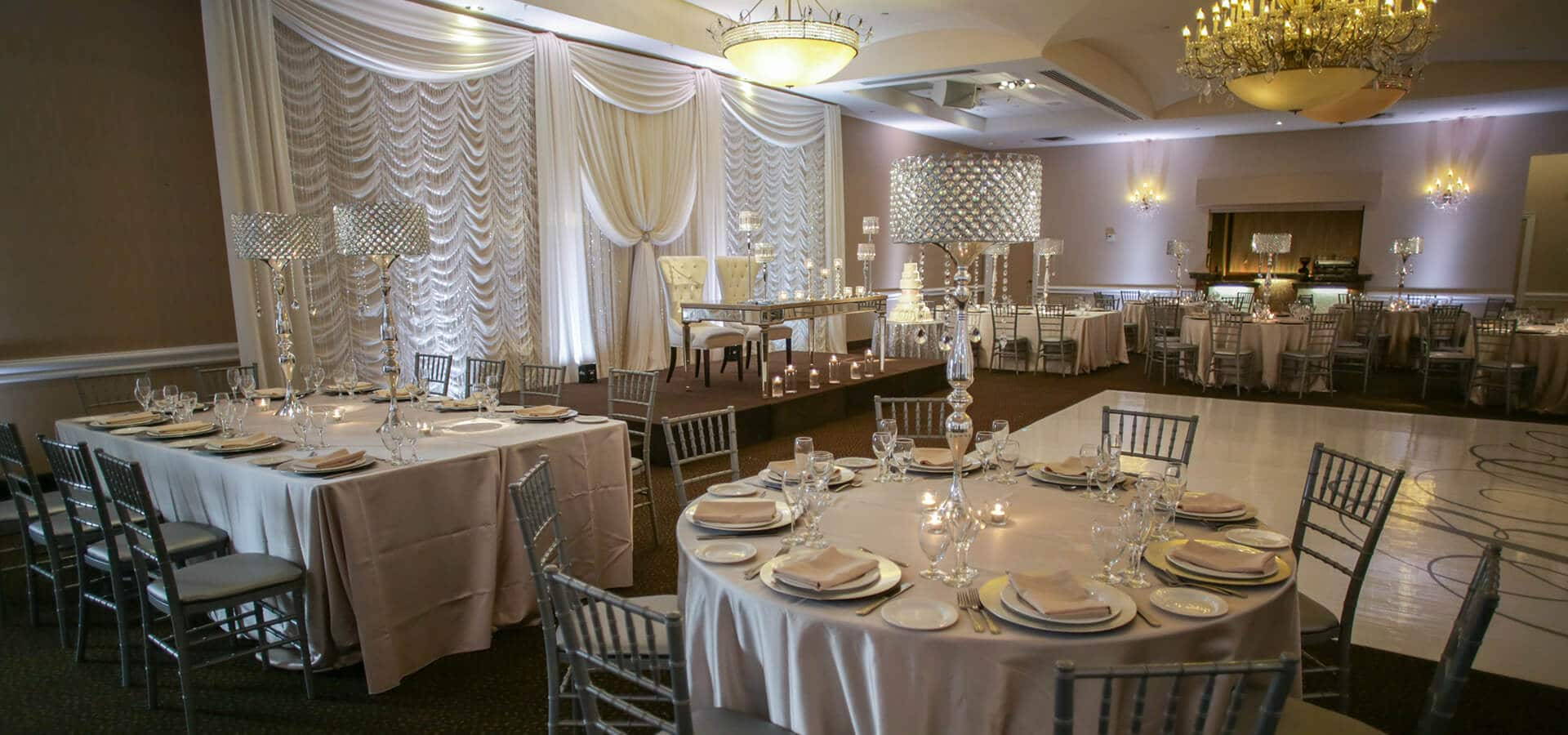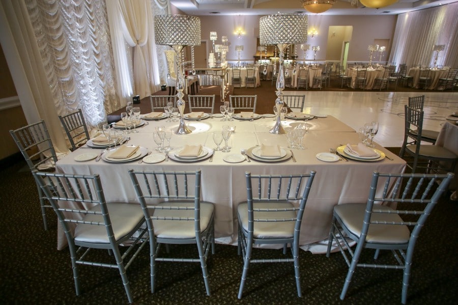 The decor team used elegant neutral colours and sumptuous satins to create a modern, romantic space. We particularly enjoy the pewter chiavari chairs, luxe table linens, and tall crystal centerpieces! The intimate reception space had a warm, upscale ambiance and was perfectly set off with a custom wrapped dance floor designed by DFD Event Solutions.