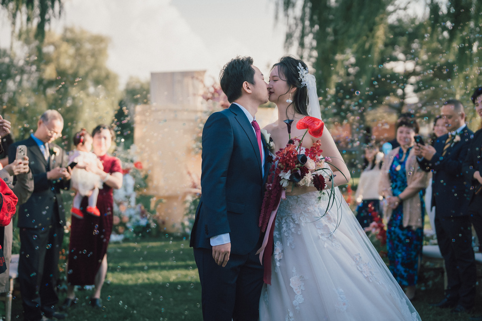 Their first look was incredibly sweet, giving them a chance to breathe together before the ceremony began. The setting was peaceful, framed by soft florals from Amor Wedding and the charm of the vineyard around them. Aya’s walk down the aisle was emotional, and their vows brought both smiles and a few happy tears. When they sealed it with a kiss, everyone was cheering.