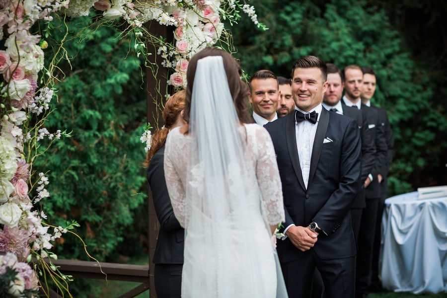 The couple exchanged vows in front of their friends and a family in a picturesque outdoor ceremony, featuring by a stunning floral arch.