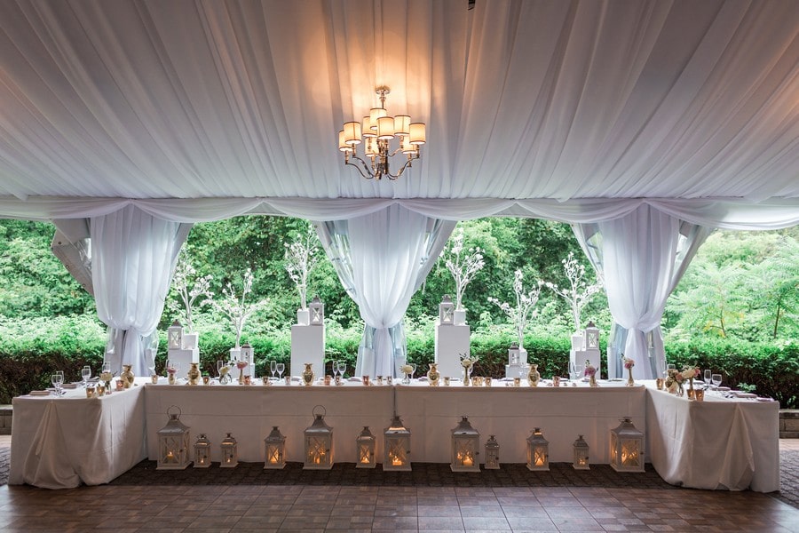 From the perfect (and pretty) tent, to the chic chandeliers, to the beautiful blooms by Cool, Green & Shady, the couple’s elegant reception is simply dazzling from every angle. Guests feasted on a delicious meal courtesy of en Ville Event Design and Catering, and later indulged their sweet tooth at the adorable sweets table.