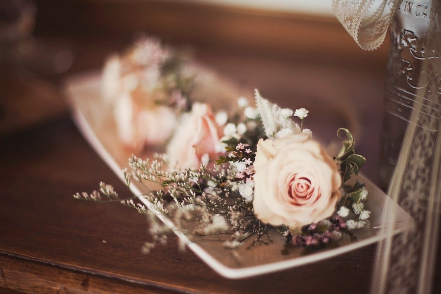 The couple’s cozy reception was held in a picturesque barn illuminated with strings of sparkly white lights and ornate chandeliers. Bouquets of delicate wildflowers lined the antique farm tables along with pretty floral dishes. Romantic poems and pictures of the couple brought an intimate, personal touch to the rustic surroundings.