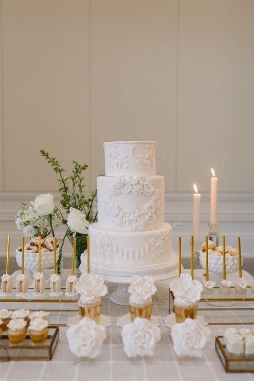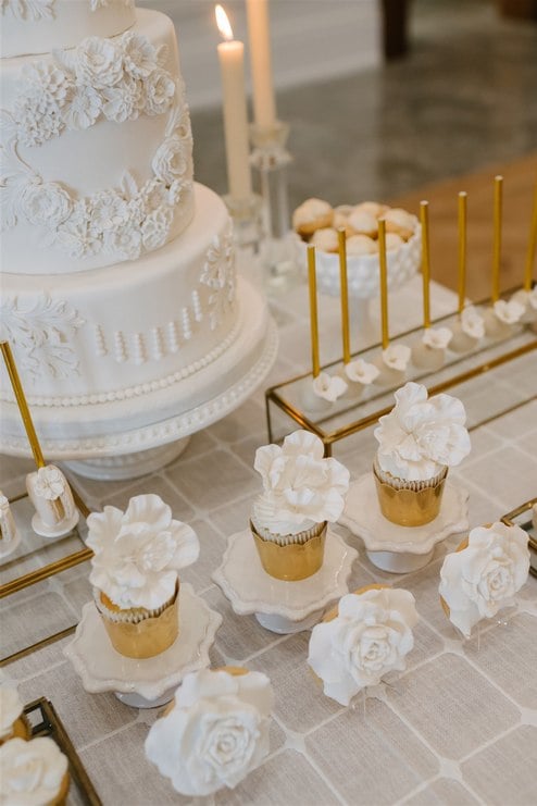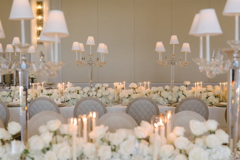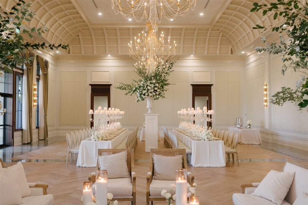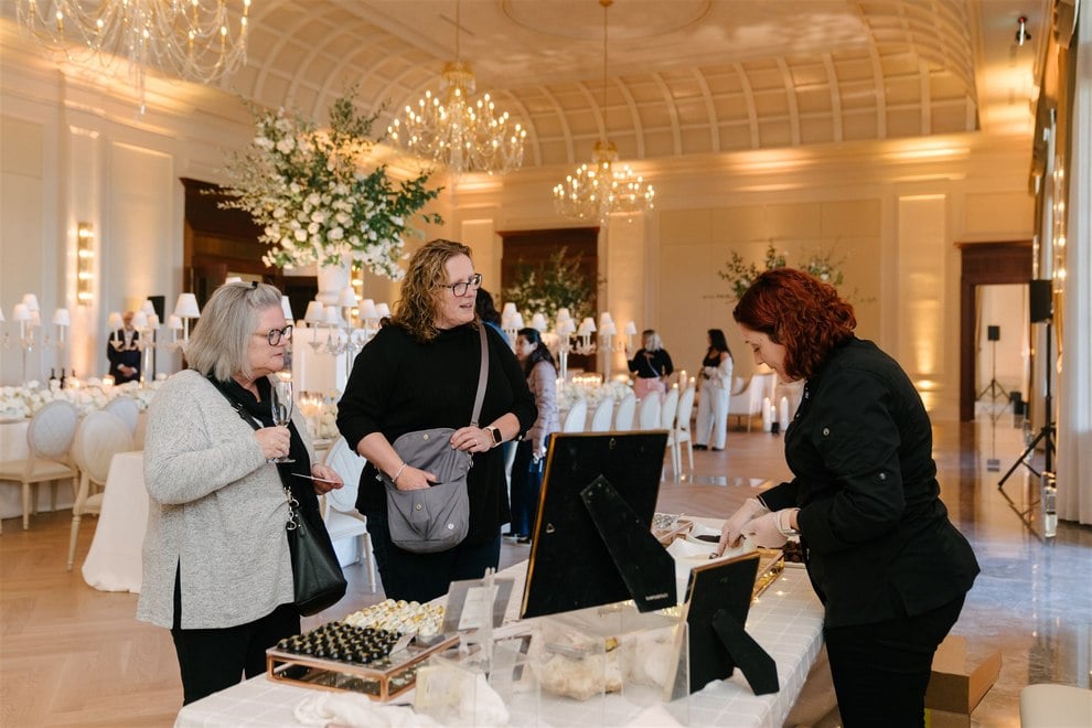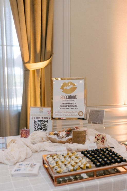 Inside the ballroom, the dessert display by Sweet Celebrations immediately catches the eye. A detailed white cake surrounded by petite sweets perfectly complements the event’s timeless aesthetic, while Succulent Chocolates tempts guests with handcrafted truffles and custom chocolate bars — the perfect favour or late-night indulgence. Finishing touches by Petite Prints and Beyond Engravables complete the experience with custom stationery and signage that add a polished, personal flair.