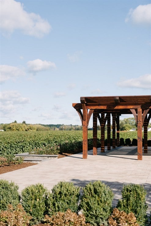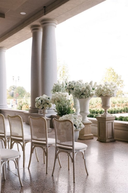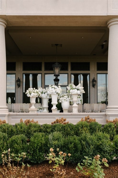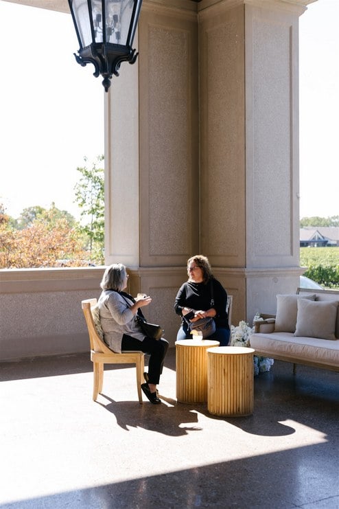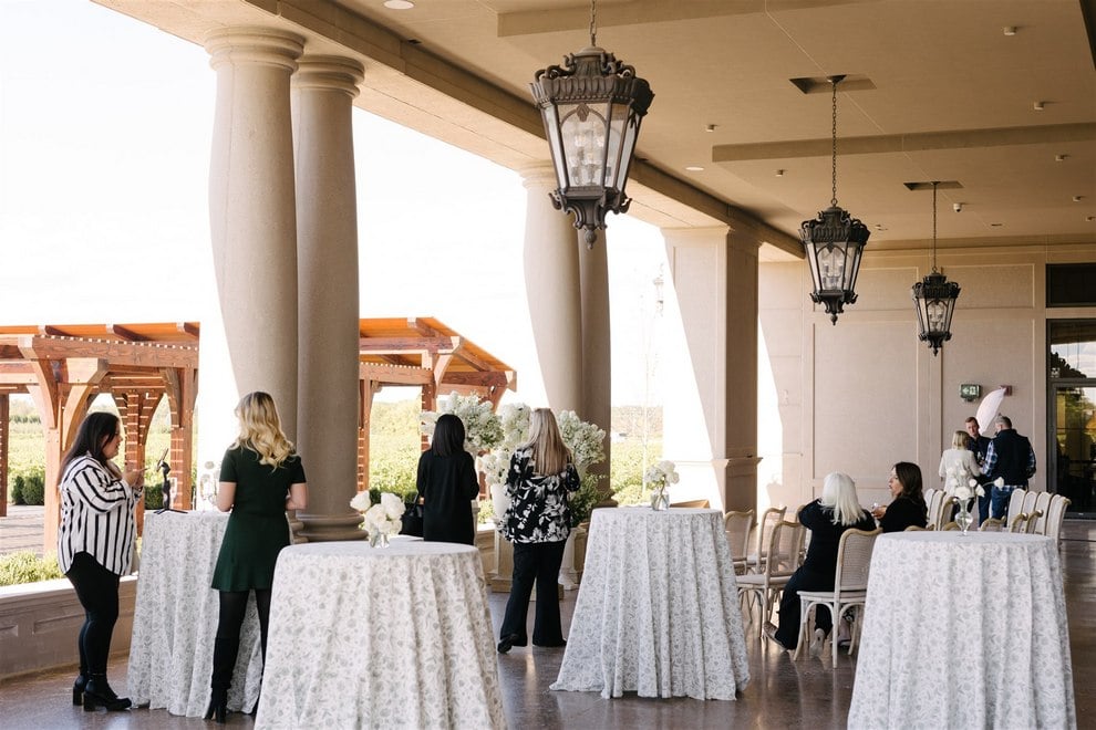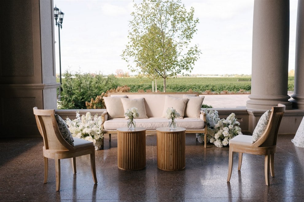 The Pergola ceremony space is pure magic, surrounded by rows of lush Cabernet Franc vines and manicured gardens. It’s a romantic backdrop that turns an “I do” into a moment straight out of a dream. Just steps away, the covered terrace features soaring columns, soft natural light, and panoramic views that flow effortlessly from ceremony to cocktail hour.