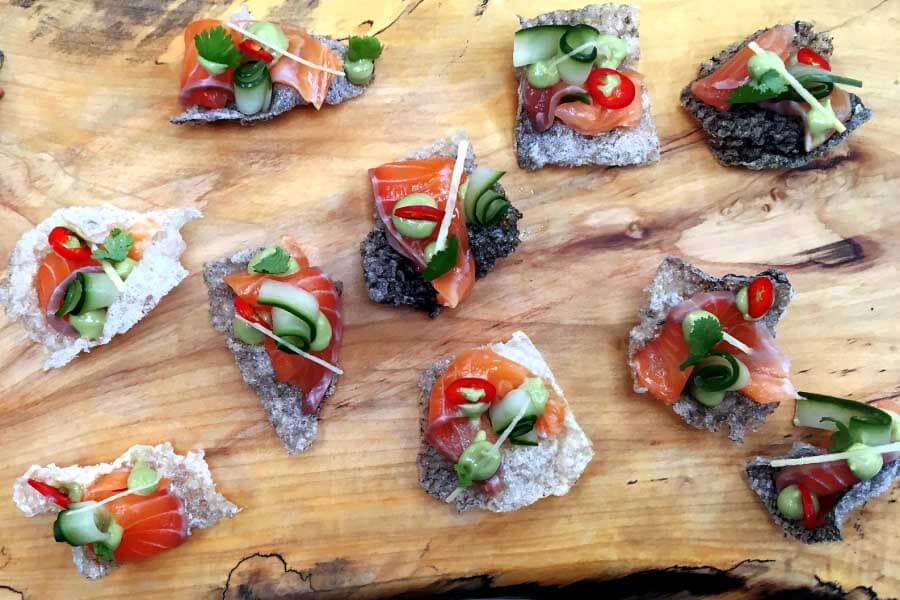 with avocado chutney, pickled cucumber, ginger, chili, and cilantro“This salmon dish is our signature passed snack showcasing both technical skill and dedication to sourcing product sustainably. A lightly cured piece of organic salmon loin is served on a puffed salmon skin – kind of like salmon chicharron – and finished with a zesty avocado chutney and classic flavour affinities. This Sashimi has been a hit at every wedding we’ve done before – and we predict it will continue to be popular in 2017!”