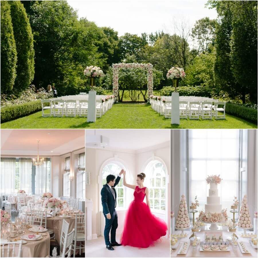 There are so many reasons why this is one of our favorite weddings of the year. Both the wedding ceremony and the reception took place at the most beautiful venues in Toronto. Their first look and wedding ceremony took place at Graydon Hall Manor followed by a wedding reception at Estates of Sunnybrook. With a team of amazing vendors, we brought our couple’s vision to life – from all the floral and decor, to the sweet table and unique place setting for each guest in various shades of pink and patterns pairing with gold cutleries. Everything is so picture perfect.”