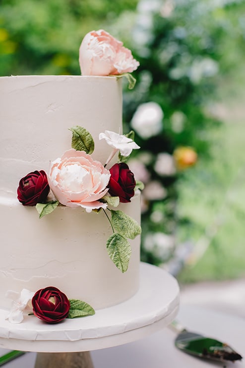 “Erica and Matejs were supposed to get married in April 2020, then postponed to November 2020, but then decided to change it to September 2020 – and they are soooo glad they did, as that was when the gathering numbers had increased. It is my favourite wedding cake this year as Erica loved the look of the sugar flowers I made. Instead of choosing fresh florals (which tends to be the trend) she insisted on handmade sugar flowers, which I LOVE and enjoy making. They did reduce the size of the cake due to the gathering limitations, but it was still beautiful (buttercream finish with handmade sugar flowers)!”