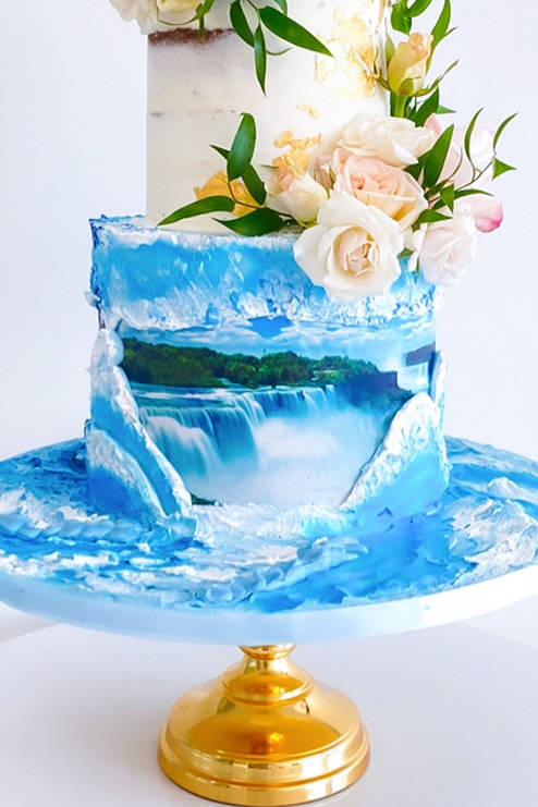 “What makes this cake unique is our love for Niagara. Our couple, Dharshika & Rory wanted to incorporate their favourite hangout location in their cake design while maintaining the rustic look of their theme. Sandra came up with the design of the day and night views of the Niagara Falls on the bottom tier of the cake using buttercream and a semi naked design for the two top tiers. This fitted perfectly into the theme and they loved it. ”