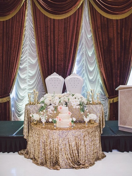 The newlyweds’ reception was the perfect luxe celebration: an opulent ballroom, twinkling chandeliers, towering gorgeous floral arrangements, golden hues, and tiny bottles of champagne – what more could you ask for?