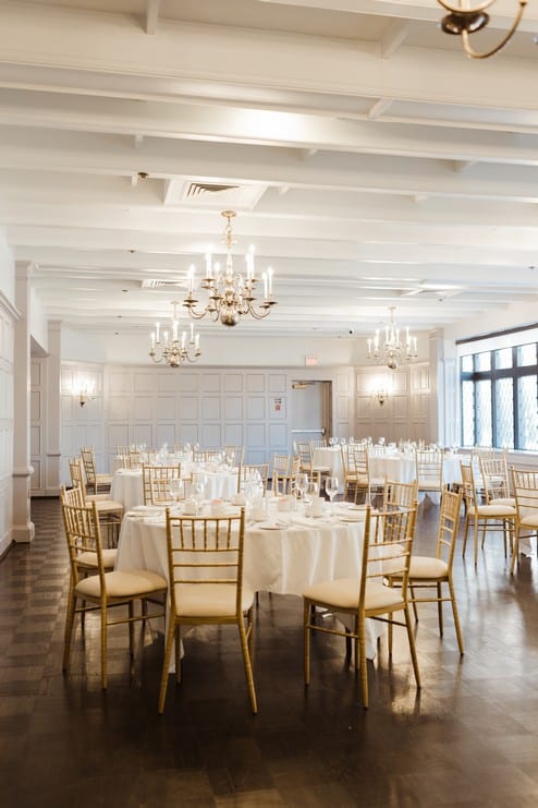 The Guildhall offers guests a charming and intimate space. Flooded with plenty of natural light thanks to the room’s floor-to-ceiling windows, the elegantly decorated tablescapes were provided by Chair Decor, Plate Occasions, and Oleander Floral Design. Personally, I loved the water goblets, which are still a continuing trend for 2023.
