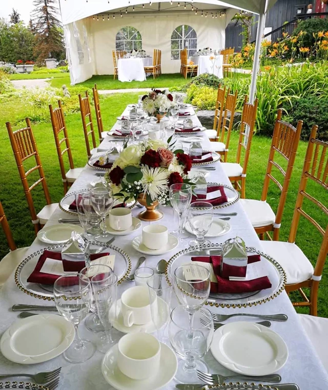 The venue offers both indoor and outdoor event spaces that are perfect for celebrations. The outdoor chapel is an ideal place to host your ceremony or to arrange a bridal photo shoot. It can comfortably accommodate 225 guests. The dining room, meanwhile, features a magnificent cathedral ceiling and a cozy fireplace. This setting can be used to host receptions, and it can accommodate up to 200 guests.